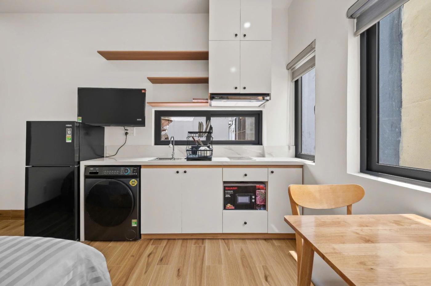 Deluxe King Studio. Offering free toiletries, this studio includes a private bathroom with a shower, a hairdryer and slippers. Guests can make meals in the kitchen that has a stovetop, a refrigerator, kitchenware and a microwave. The air-conditioned studio offers a flat-screen TV, a washing machine, soundproof walls, a wardrobe as well as city views. The unit has 1 bed.